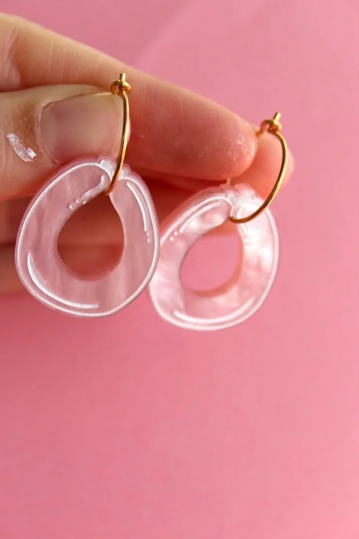 Medisterøreringe i pleksiglas med hånddekorerede detaljer.