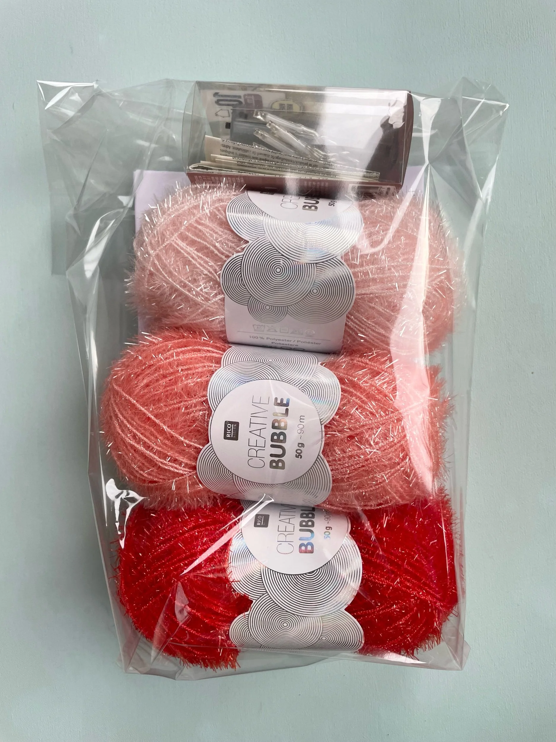 Med 3 nøgler garn i forskellige farver.